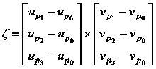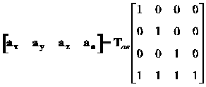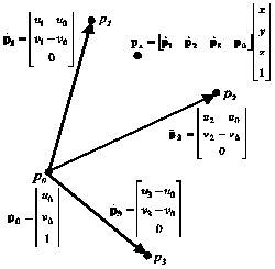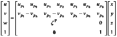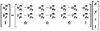 If in an image, Im, the projection, [upi vpi 1]T of the four points, pi i = 0 ... 3, which define the affine basis is known then the projection, [up vp 1]T of any point, p, with homogenous affine coordinates [x y z 1]T can be calculated as