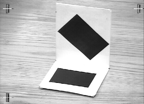 The trackers each receive video input from a video camcorder viewing the scene. The user initializes each tracker to track two rectangular regions. The tracked regions are outlined on the output image for each tracker. After the second tracker is initialized data is exchanged between the two trackers and the location of the affine basis points and the affine frame of reference is computed. Note that the system can also be initialized with a single camera. In that case, it is necessary to move the camera, or if possible move the tracked regions, to provide the second view that is needed for initialization of the system. The view from an operating tracker is shown in Figure 11. Note that the two regions being tracker are outlined, and the axes for the affine basis that has been chosen is also shown. As the small frame is moved around in front of the cameras the user gains a sense for the orientation of the affine basis.