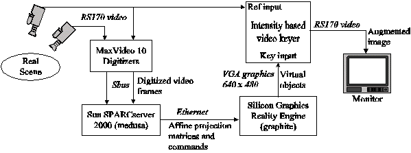 The design of this prototype augmented reality system very closely follows the architecture for a typical augmented reality system given in Figure 4. A block diagram of the components in this system is shown in Figure 9.