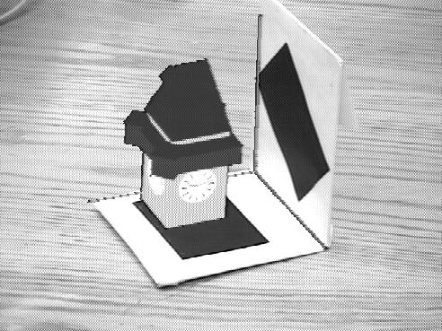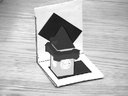 Once the initialization of the system is completed, the system executes in a tight loop performing two operations. One of the trackers is queried for the new projection matrix. Note that once the virtual object has been transformed into the affine frame of reference by calculating Tae only one camera is needed. The tracker attached to the selected camera is queried for the new projection matrix which is calculated from the projections of the affine basis points as described in Section 2.5. This new affine projection matrix is transmitted to the graphics server which then renders the scene with the new projections. The augmented image is viewed on the monitor attached to the keyer output. Sample augmented scenes of a virtual clock tower that were generated by this system are displayed in Figure 13.