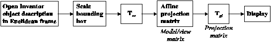This has the same 4x4 form as the viewing matrix that is commonly used in computer graphics systems to perform transformations of graphic objects. The difference between the affine projection matrix and the graphics system viewing matrix is in the upper left 3x3 submatrix. In Equation 6 that submatrix is a general invertible transformation whereas when working with a Euclidean frame of reference it is a rotation matrix. The structural similarity, however, allows standard graphics hardware to be used for real-time rendering of objects defined in the affine frame of reference developed here. The power of a graphics processor such as the Silicon Graphics Reality Engine can be directly used to perform object rendering with z-buffering for hidden surface removal.
