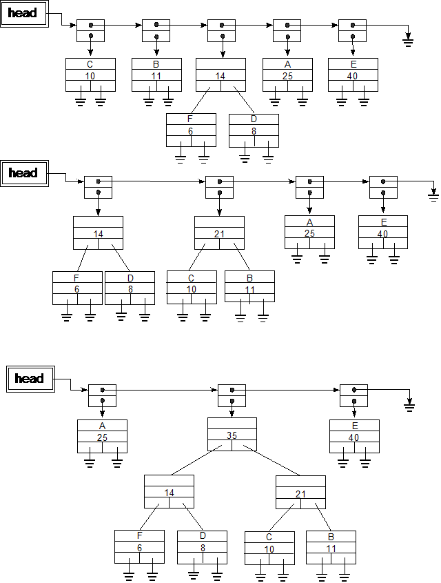 Next we remove the first two trees from the list, create a new tree node with the smaller count to the left and the larger count to the right, and then reinsert this new tree into the sorted list. The following diagrams show the state of the list after the first three such extractions, tree node creations, and reinsertions: