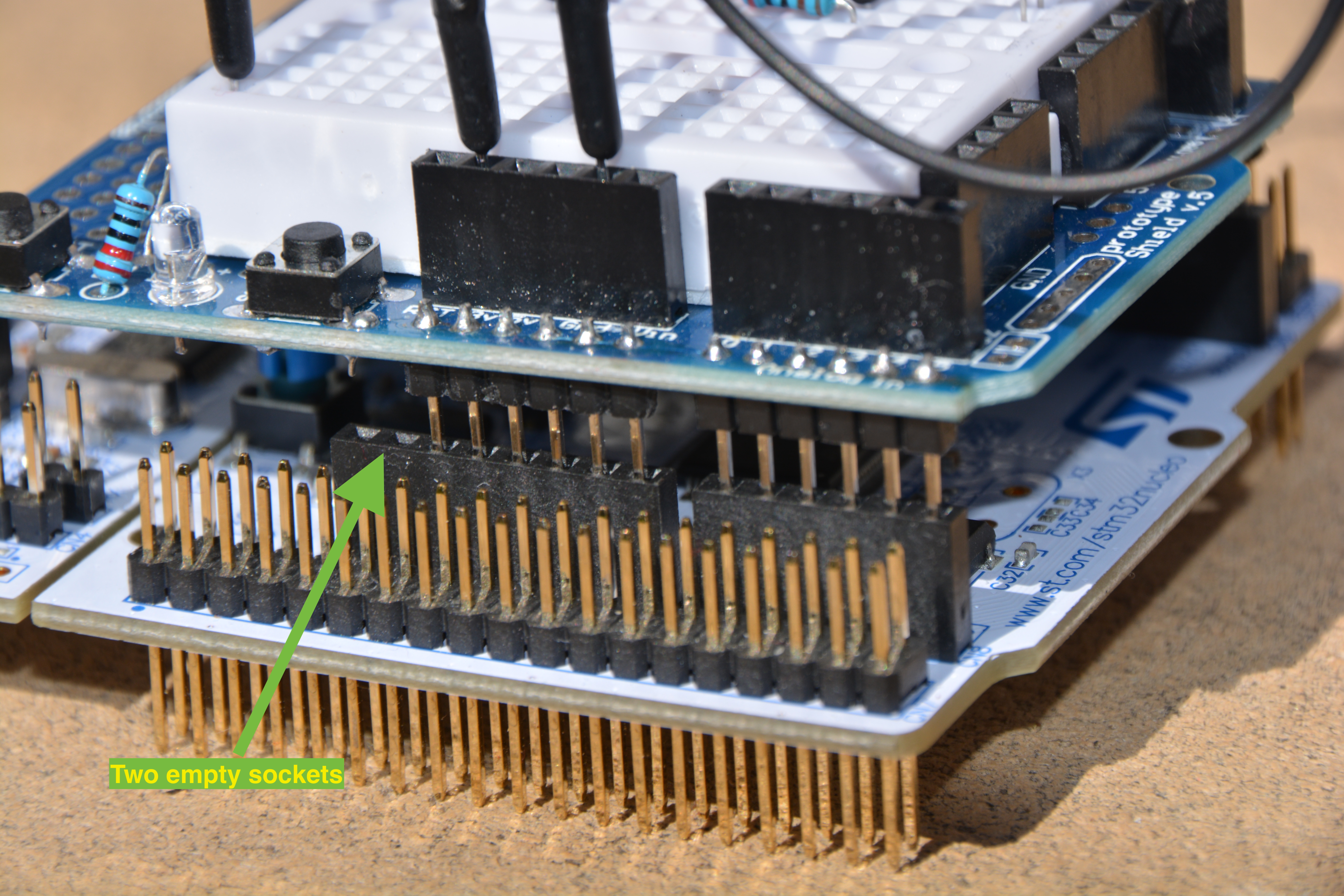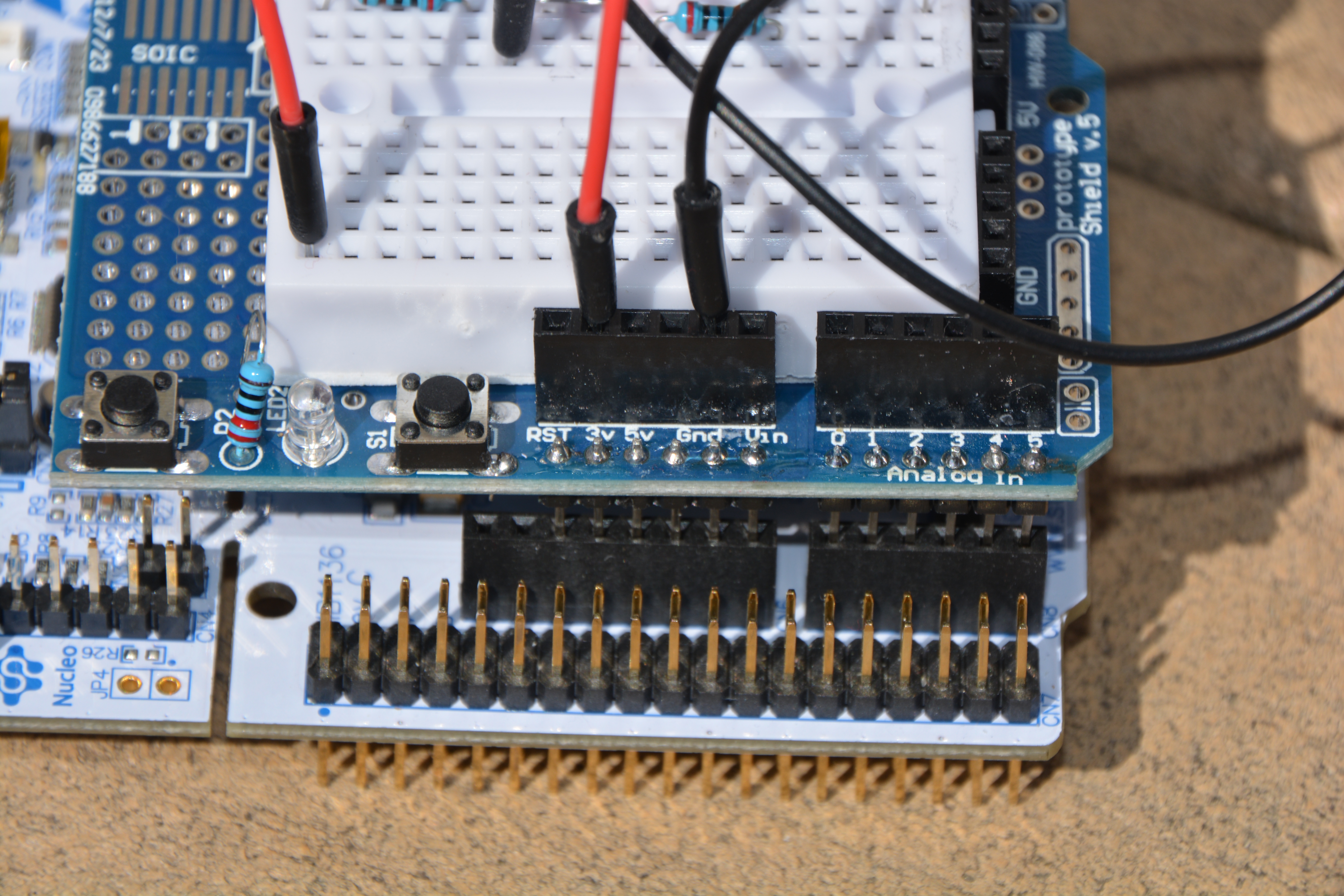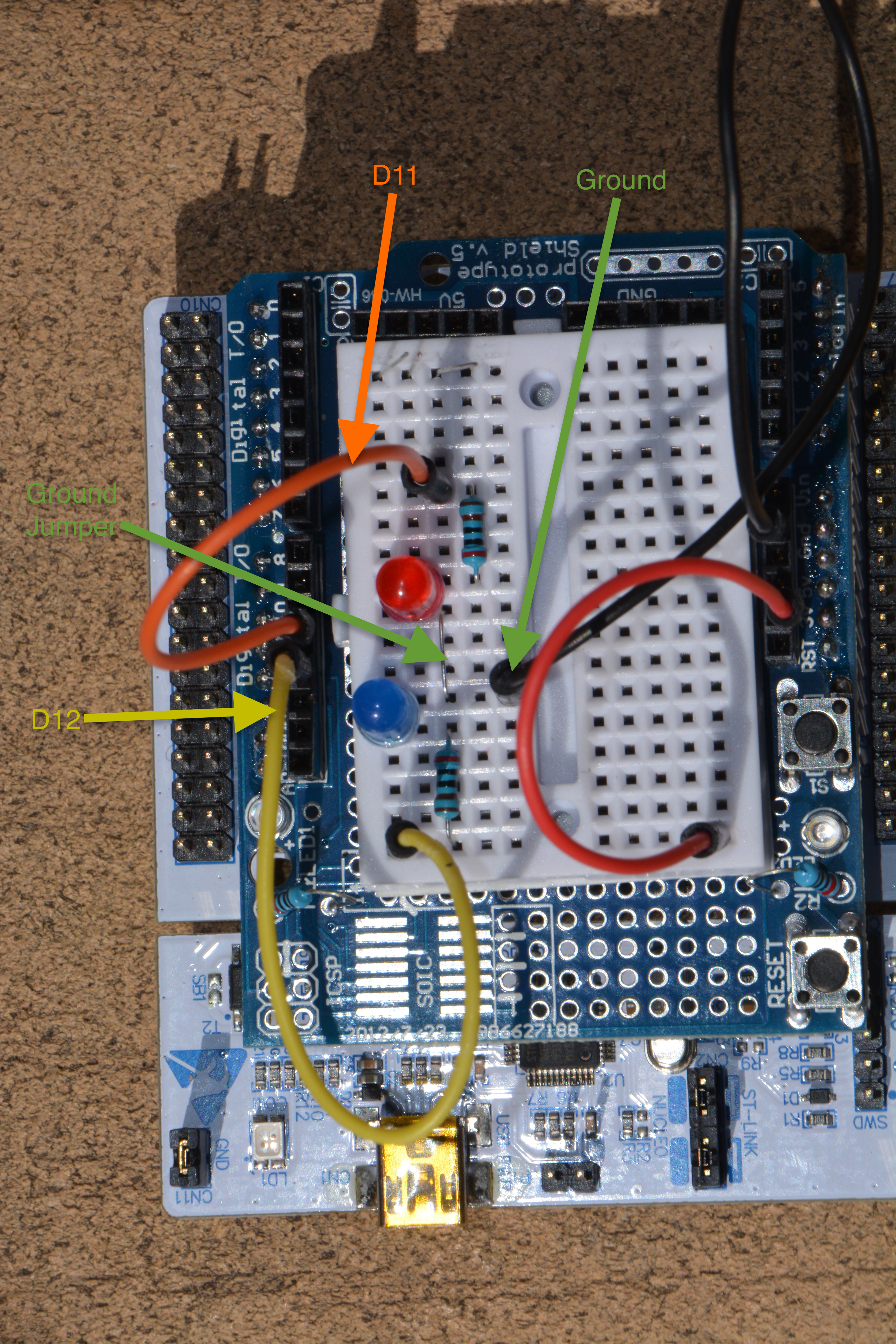 Connect the red LED to Arduino pin D11 (Nucleo PA7) and the green LED to Arduino pin D12 (Nucleo PA6).
